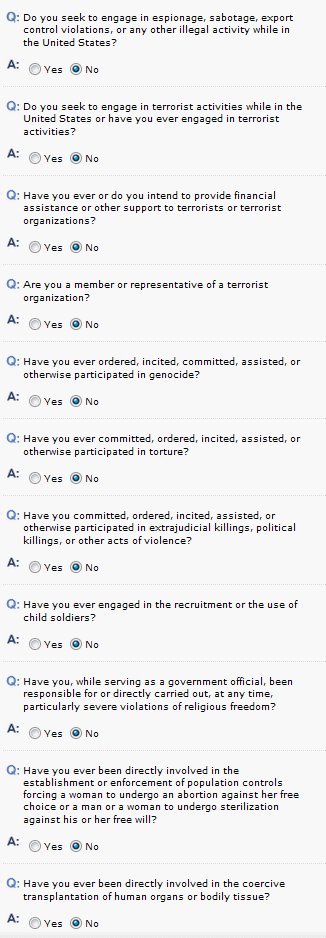 - There are lots of crazy questions about things like moving to the US to be a prostitute, or having an army of child soldiers. As far as I can tell, the reason they do this isn’t because you’ll admit to those things, but because it makes it very easy for them to cancel your visa if they have reason to believe you lied on your application. Much easier than having to prosecute you in an American court for having an army of child soldiers in your past in another jurisdiction.