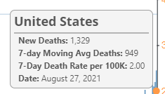 The CDC also maintains a useful dataset for Deaths over time. Unlike the Hospitalizations data (at the time of writing), this chart requires you to choose a Right Axis of Deaths per 100K people over the prior 7 days, since by default it just shows the counts (which while representative of the deep loss of a life and family, aren't useful for comparisons of different things we have come to accept as "part of life").