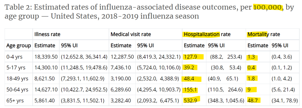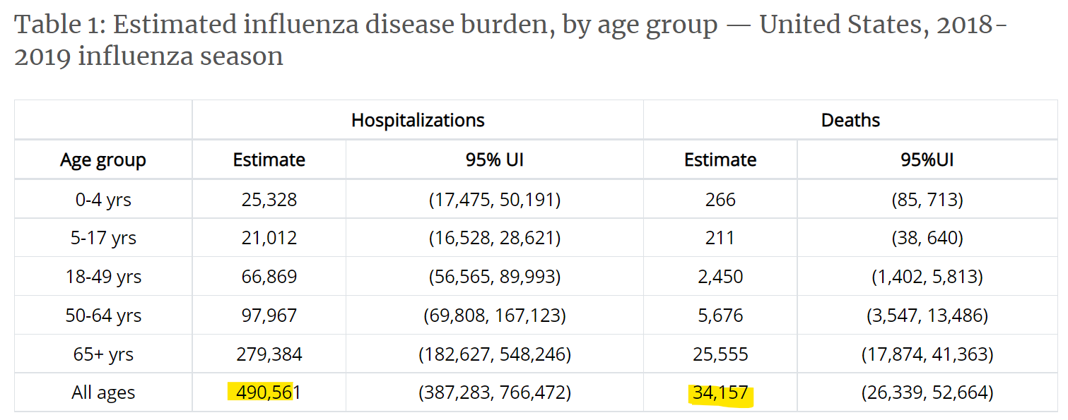 For the last full year before COVID-19, the CDC produces an estimate of the number of hospitalizations and deaths from Influenza in a detailed report for the 2018-19 United States Influenza season.