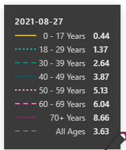 At the time of writing, it was 3.63 for all people in the United States. It ranged from as high was 8.66 for 70+ year olds and as low as 0.44 for <18 year olds.