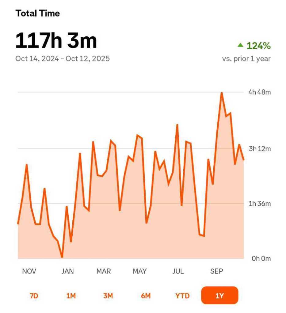 - August 2024 – Joined a gym and started strength training with a trainer, Avishai. I knew almost nothing (and still have plenty to learn), and after he moved away in October, I used ChatGPT to take pictures of the equipment in my new gym and then create a workout plan, which I then loaded into Hevy. This syncs with Strava and Fitbit, and helps me track performance.