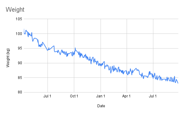 - December 2024 – By the end of the year I was down 12kg (26lbs). For the first time in forever, I didn’t create an empty New Year’s resolution around "getting healthy", but instead just had to stay the course.