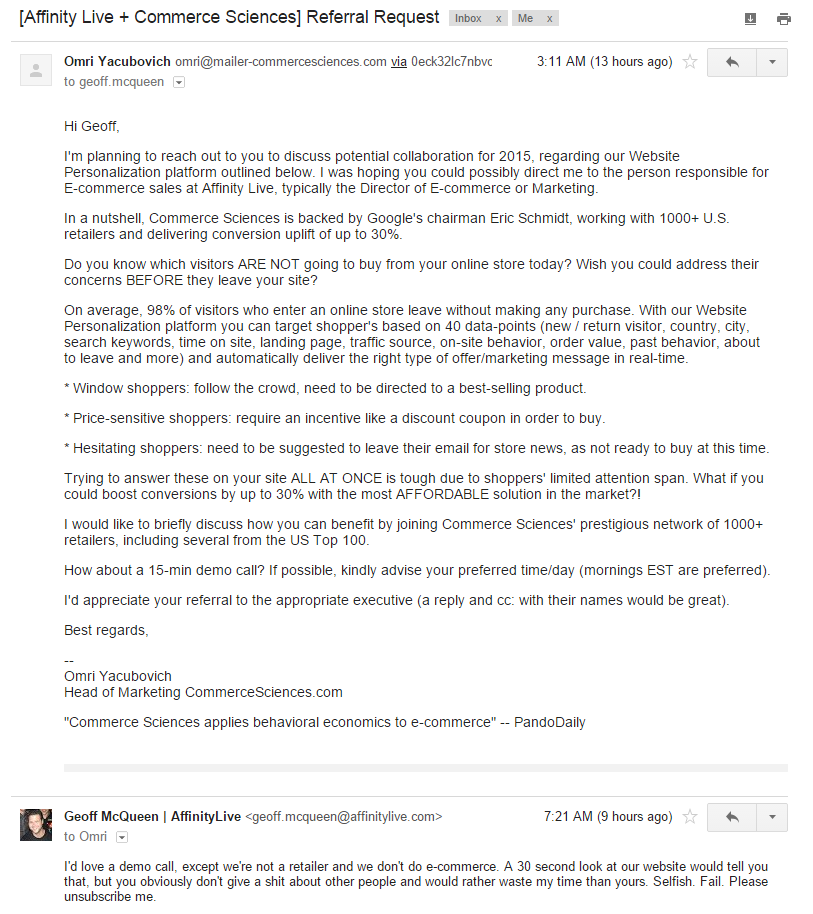 Omri did a bit better than Joe last month - he got our company name right - but after that it was fail all the way. Aside from being way to damn long for a cold email, Omri had a lot of confidence that CommerceSciences.com could really help us here at AffinityLive, if only I'd connect him to the person responsible for E-commerce sales - and then helpfully suggested it may well be our Director of Marketing.