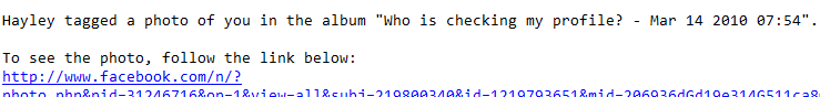 Yesterday afternoon, I received a Facebook notification from a friend I haven't seen for about 6 months. It said she's tagged me in a photo album, called "Who is checking my profile? - Mar 14 2010 07:54". This struck me as pretty weird - since I hadn't seen this friend for a while, I didn't think there was much chance I could have been tagged in a photo recently. I checked the email was really from Facebook - it was - and the message also appeared in my new notifications within the Facebook system, so it wasn't a case of sneaky phishing.