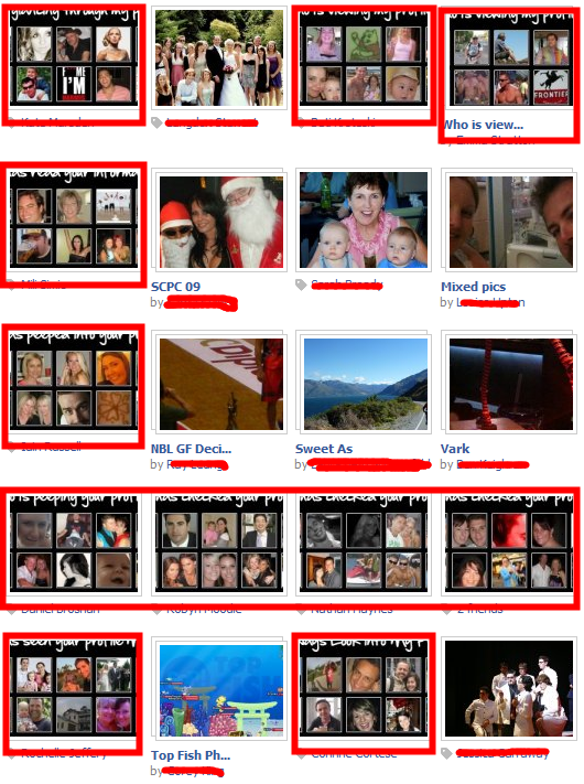 Tonight I went look for a photo I'd uploaded a week or so ago, and I clicked on the "Photos" icon on the left hand navigation. What I saw stunned me - many of my friends all had a very similar most recent album. 11 out of the 20 photo albums displayed - 55% - were showing this spam/phishing application's calling card as their default picture/most recent album.